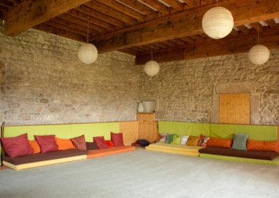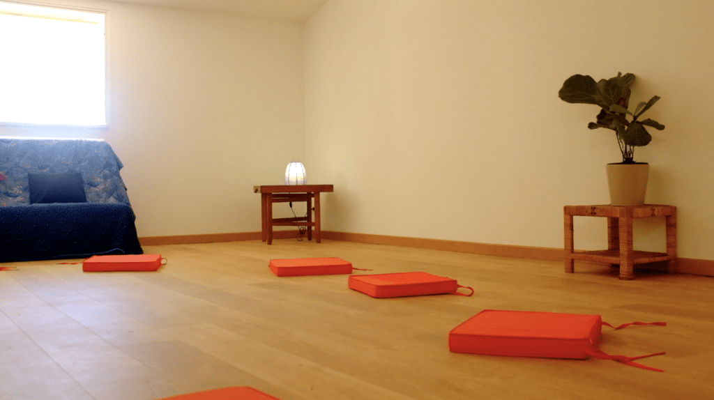 – une salle de pratiques, équipée de matelas, coussins, chaises et tabourets de méditation,